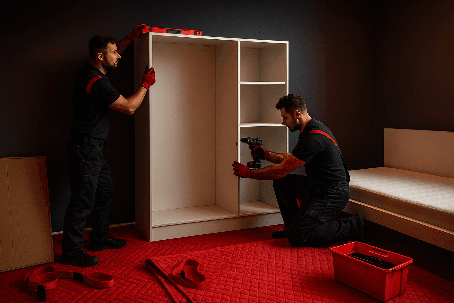 Dostarczamy, wnosimy i składamy meble zgodnie z instrukcją. Zabezpieczamy podłogi i ściany, a po montażu zabieramy opakowania.
